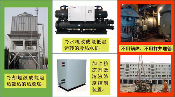 熱源塔熱泵系統純粹使用電力,系統更換十分方便,只要把冷卻塔改成夏天可以散熱、冬天可以吸熱的熱源塔,主機更換為可以低溫制熱的主機,再加上一些配套設備,即可取消鍋爐,由于施工方便、節能效果好,是既有建筑改造的可行方案。
