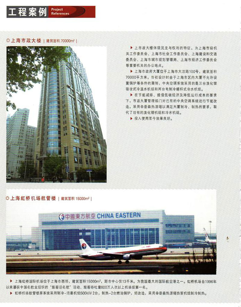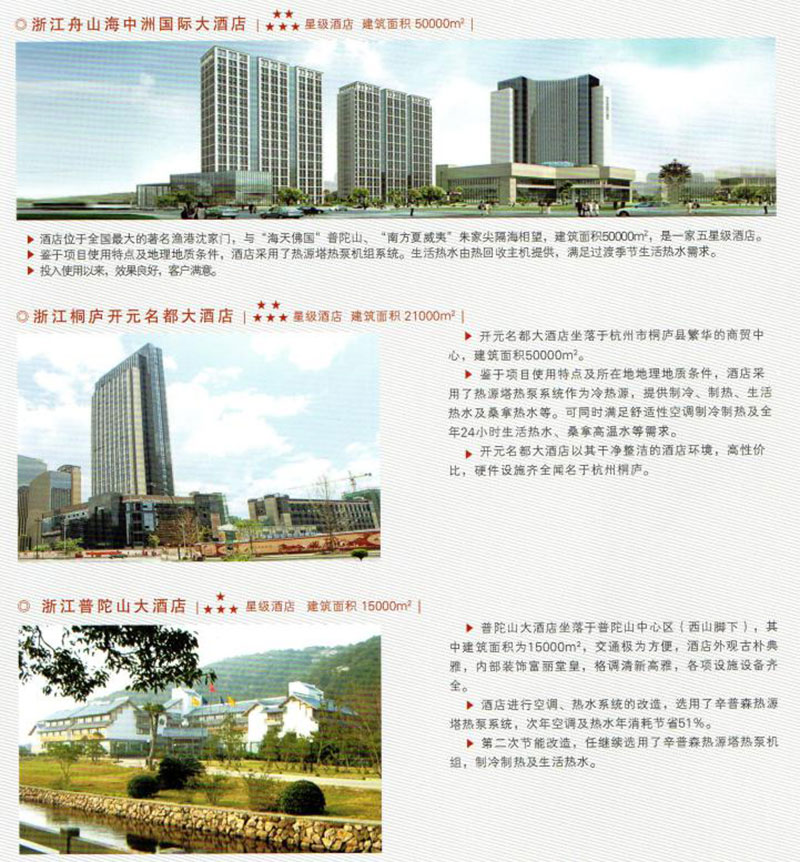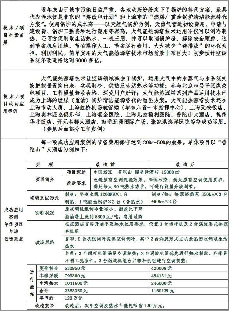 中國建筑科學研究院與江蘇辛普森新能源有限公司共同主編的中國工程建設協會標準-熱源塔熱泵系統應用技術規程已于2014年4月1日正式頒布,可見其先進性受到國家的肯定。(以上海為例)在上海市政大廈、上海瑞金醫院、上海延安飯店、上海虹橋機場航管樓、上海奧林匹克賓館、上海金門大酒店、上海兒童福利醫院等項目已有應用實例。大氣能熱源塔技術還在杭州華北飯店、開元名都大酒店、南通五洲國際廣場、張家港澳洋醫院等等成功運用;真正讓空調系統中減去了鍋爐、實現制冷制熱制取生活熱水為一體,并節能效果約在20%-50%之間,真正開辟了新能源的世界性革命。
